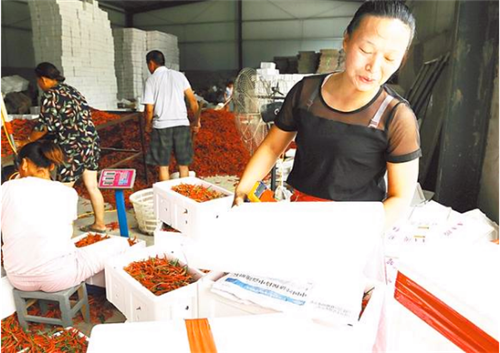 該鎮(zhèn)采取統(tǒng)一包裝、統(tǒng)一品牌、統(tǒng)一儲(chǔ)存、統(tǒng)一銷售經(jīng)營銷售模式,吸引大批外地商戶上門收購辣椒。
