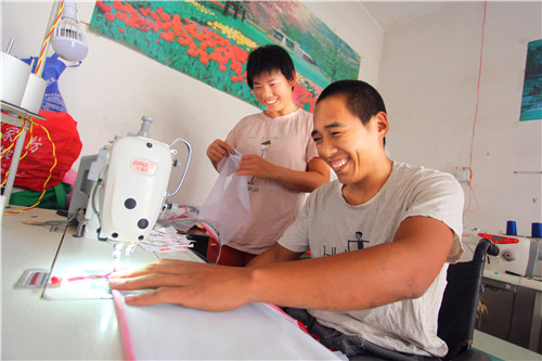 生意閑的時(shí)候,朱建舟又和妻子商量,借錢購買了兩臺(tái)縫紉機(jī),幫助附近一家工廠加工環(huán)保袋。加工活雖然不累,但對(duì)于雙腿殘疾的朱建舟來說卻很困難。一向愛動(dòng)腦筋的朱建舟自己動(dòng)手把縫紉機(jī)踏板改裝成手動(dòng)式的,大大提高了工作效率?!耙粋€(gè)月能掙2000多元錢,還能顧家,照顧病人和孩子?!蓖跷迥菪睦镉姓f不出的高興。