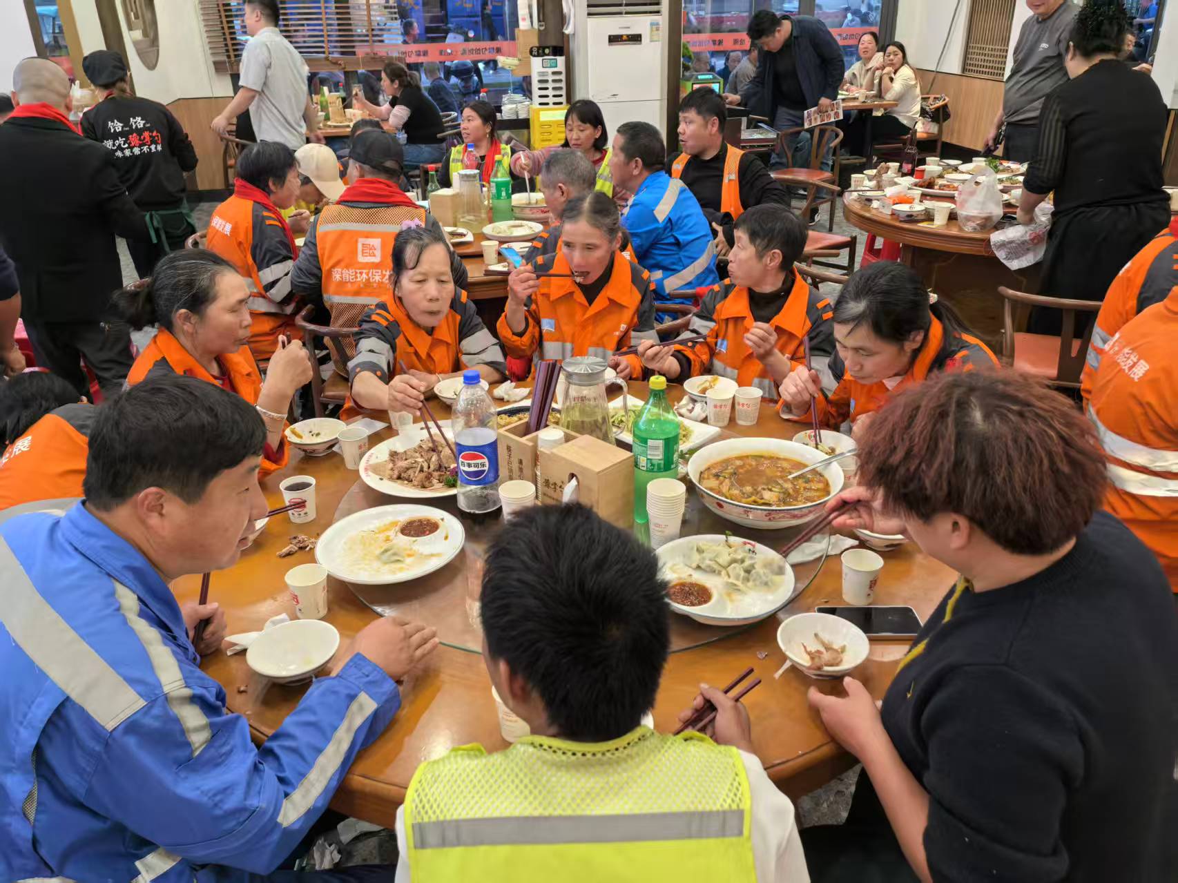 活動(dòng)當(dāng)天,剛剛結(jié)束清掃工作的“城市美容師”們身穿工服陸續(xù)抵達(dá)。張高鵬早已在門口迎接,熱情問候每一位工人并送上新春祝福。席間,道口燒雞、五香牛蹄筋、酸菜魚等十多道佳肴相繼上桌,暖意融融的用餐氛圍中,歡聲笑語不斷,如家人般親切溫馨。